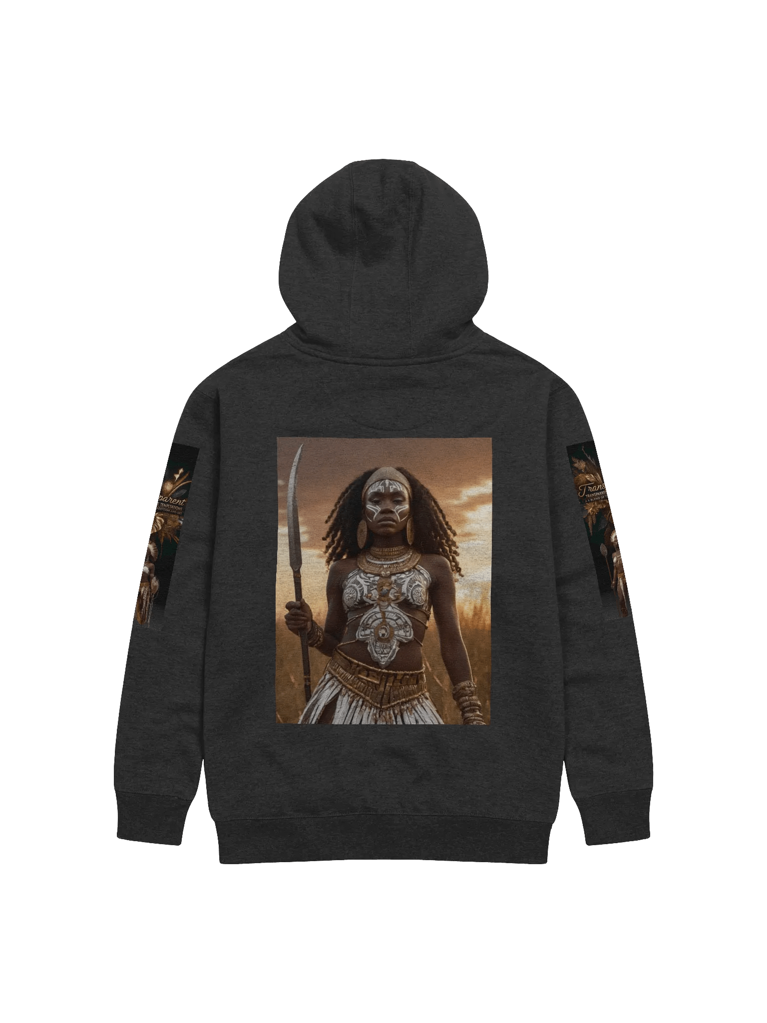 Sleeve Design: On one sleeve, the phrase "Transparent Temptations" is artfully written vertically in a sleek, modern font, with the brand's logo beneath. The other sleeve mirrors this design with the addition of the powerful phrase "African Queen Warrior" just below, creating a sense of balance and unity throughout the piece.