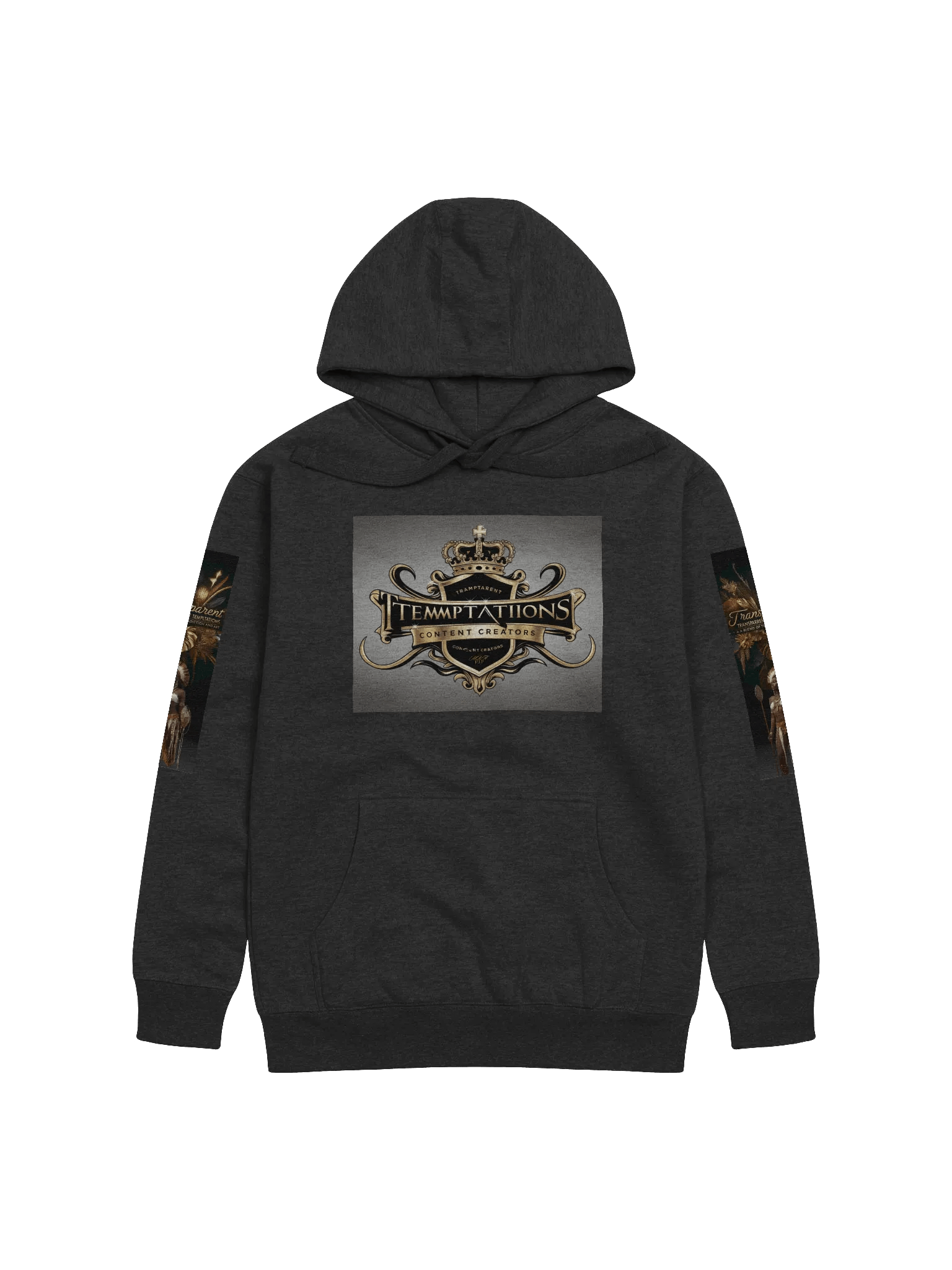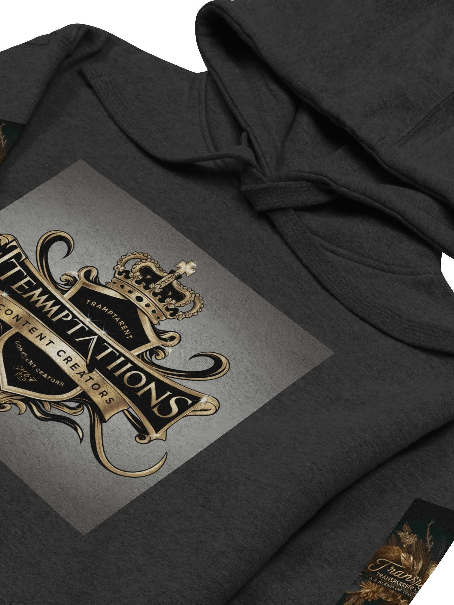 Front Design: The chest showcases the shimmering "Transparent Temptations Content Creators" logo, elegantly printed in luxurious gold and black. The bold font radiates confidence, making it the perfect emblem for those who master their craft.